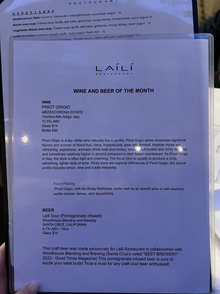 Laili Restaurant in downtown Santa Cruz offers a Mediterranean-Middle Eastern cuisine with a cozy and romantic ambiance. Known for its incredible food and service, Laili provides a diverse menu with pescatarian, vegan, and limited vegetarian options. The outdoor seating area is a favorite among customers for its lovely patio atmosphere. Customers rave about the unique and delicious appetizers, such as the squash dish, and the flavorful main dishes like the lamb shank and filet mignon kabobs. The rose meringue dessert is a standout, providing a perfect ending to a memorable meal. With friendly service, great ambiance, and exceptional food, Laili Restaurant is a must-visit spot for a casual date night or a special dining experience.